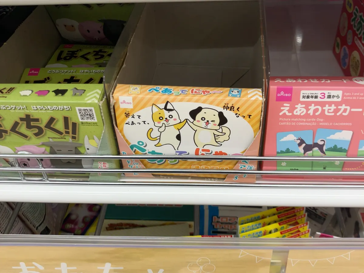 スーパーの一角にあるこじんまりしたテナントダイソーさん…「ぺあってにゃ~」を初めて見たのですが遊び方動画が2020年12月に出ているので5年前のゲームみたいですね……🤔