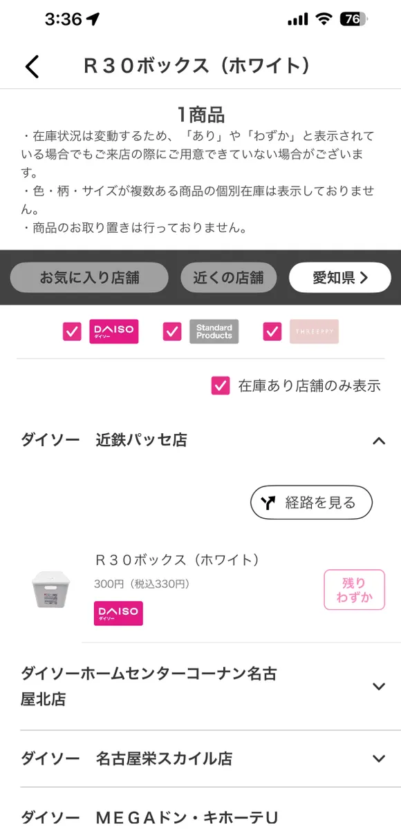 アプリ検索すると、愛知県内ではこれらの店舗で在庫があるとのこと