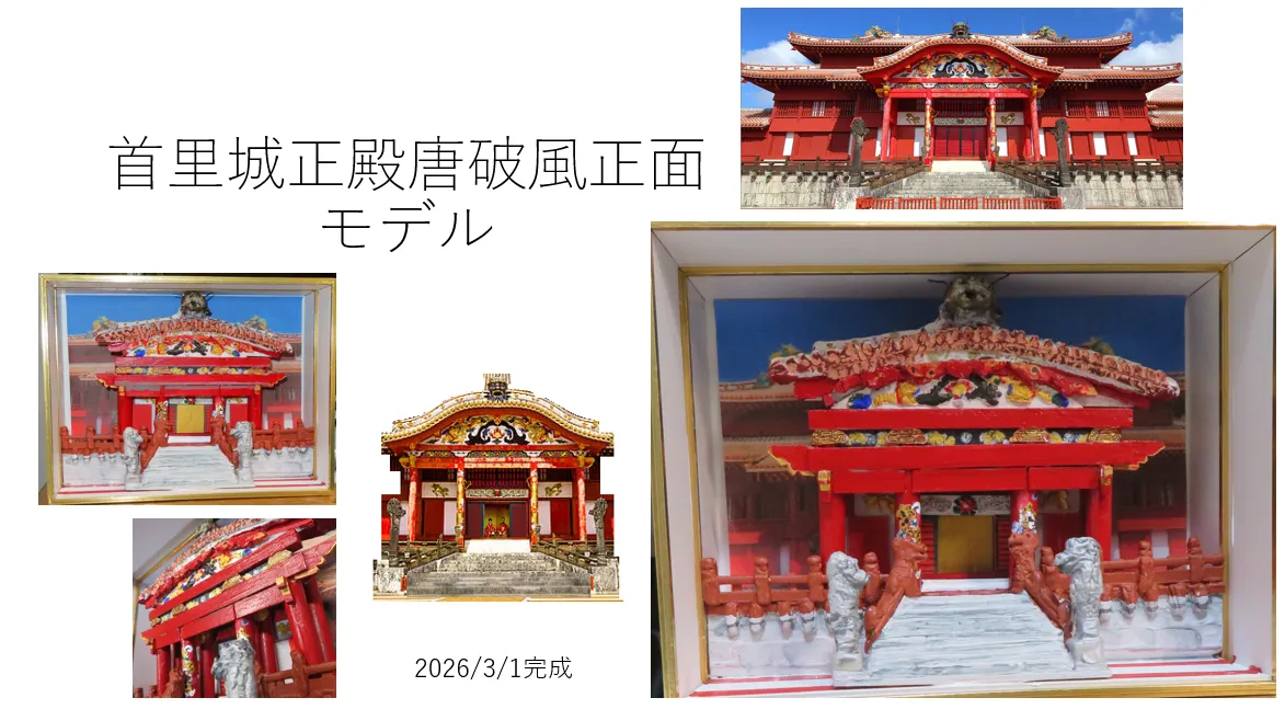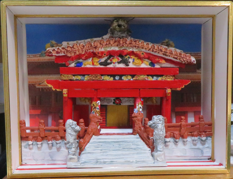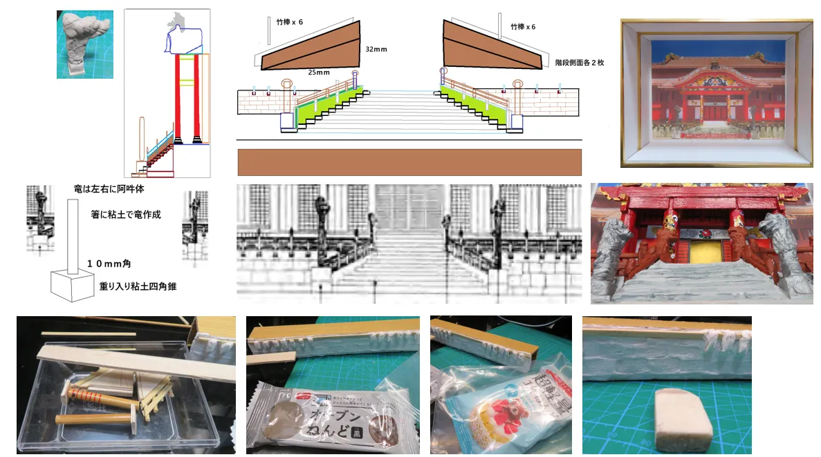 次に、超軽量工作ねんどを使うと細かい部分までレリーフが作りやすかった。乾燥後に塗装は、アクリル絵の具で。階段や正面の石垣も超軽量工作ねんどで柵の上にも使用しました。サイズがちょっとあっていませんで、てっぺんの竜がはまりきらず。