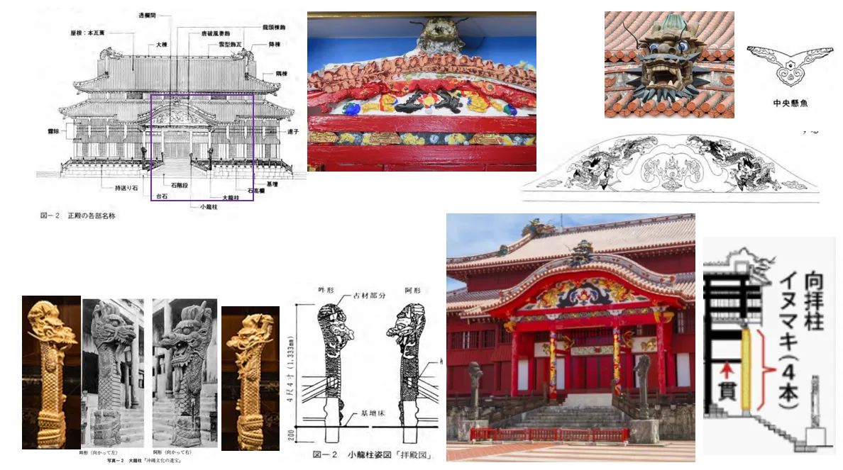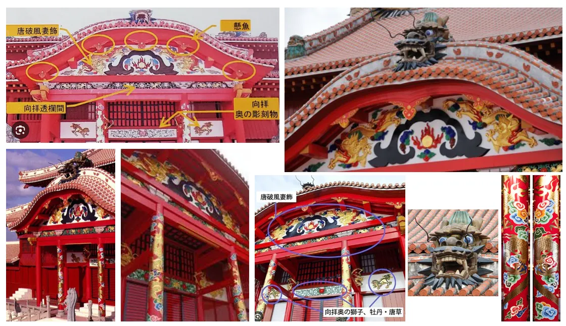 首里城の正殿には沢山の竜が配置されています。屋根の下側はごはい(向拝)と呼ばれシーサーも。