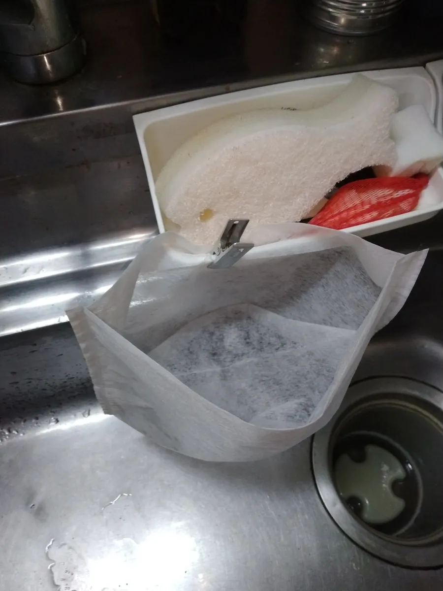 排水口を綺麗に保つには、極力水以外を流さない事が重要な為、不織布でろ過する様にしています。自立タイプですが、鍋から大量の水をかけると簡単に倒れて意味が無い為こうして吊すのがベストで、カレーなどで例え目詰まりしても一晩中かけてゆっくり水分がひいていきます。