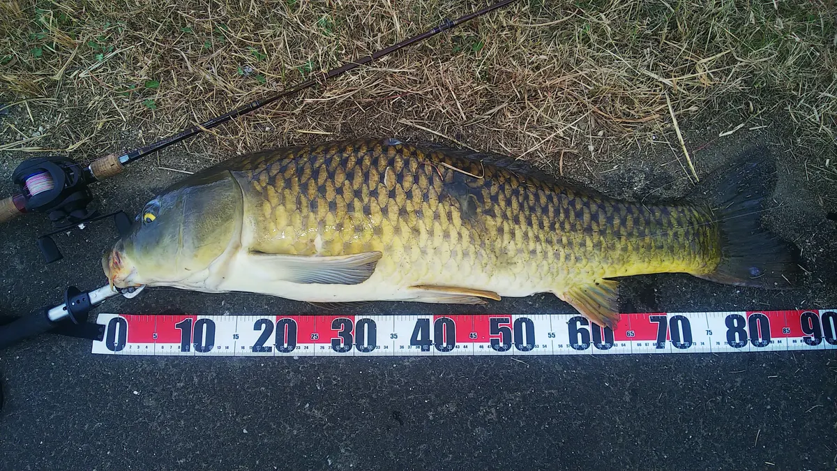 パッと見でこのクロゴイの異常な大きさに驚愕しつつ、ダイソーフィッシングメジャーで計測して見たら驚くべき事に90センチの超ド級のランカークロゴイです!😲