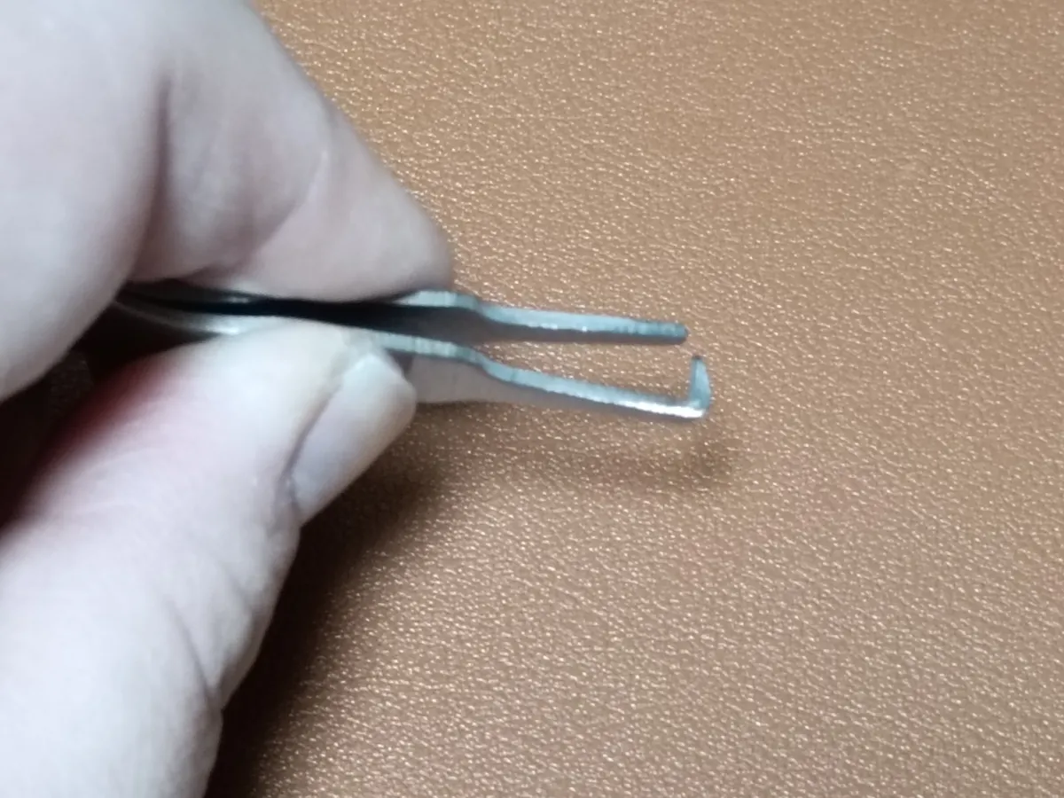 曲がっている側を二重リングの隙間に差し込み、ピンセットのようにつまむだけ。