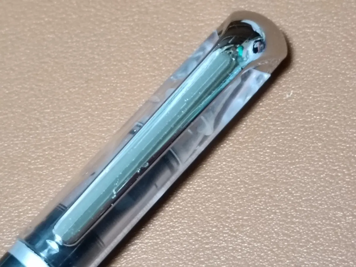 パッケージから取り出すと、110円とは思えない見た目です。キャップのクリップ部分がシルバーで、意外にも高級感があります。