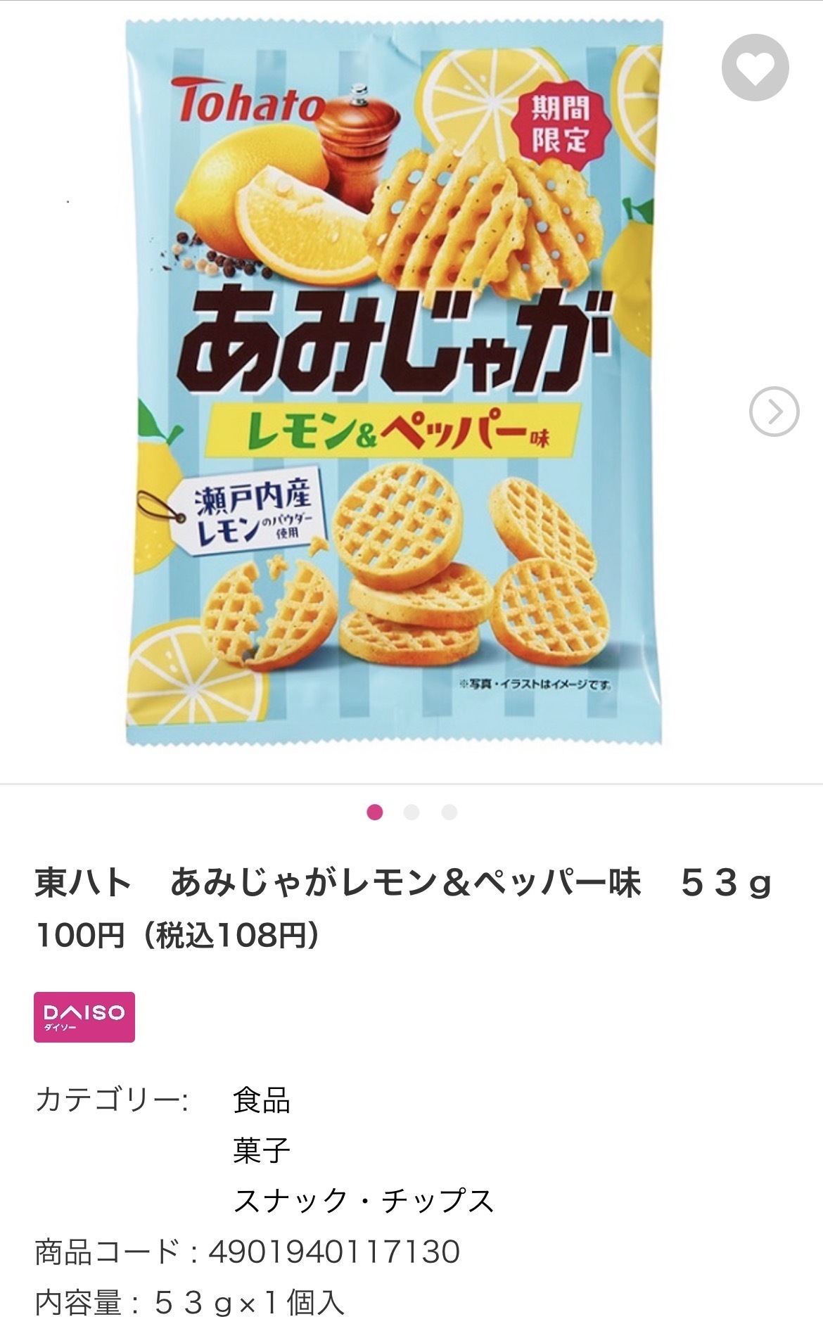 トップ > DAISO > 店舗パトロール > あみじゃが新しい味発見!! ちぽりん STAFF 2026/04/11 12:16 あみじゃが新しい味発見!! あみじゃが 期間限定 レモン&ペッパー味 気になる方は、是非チェックしてみてください! DAISO 期間限定 あみじゃが いいね 共有する 共有する X facebook LINE リンクをコピー コメントする 1 件の返信 (新着順) ミュートしたユーザーの投稿です。 投稿を表示 のむくん 2026/04/12 21:08 レモンとペッパーの組み合わせ絶対美味しいですね! いいね 返信する ミュートしたユーザーの投稿です。 投稿を表示 ちぽりん STAFF 2026/04/12 23:55 のむくん ですよね! いいね 返信する