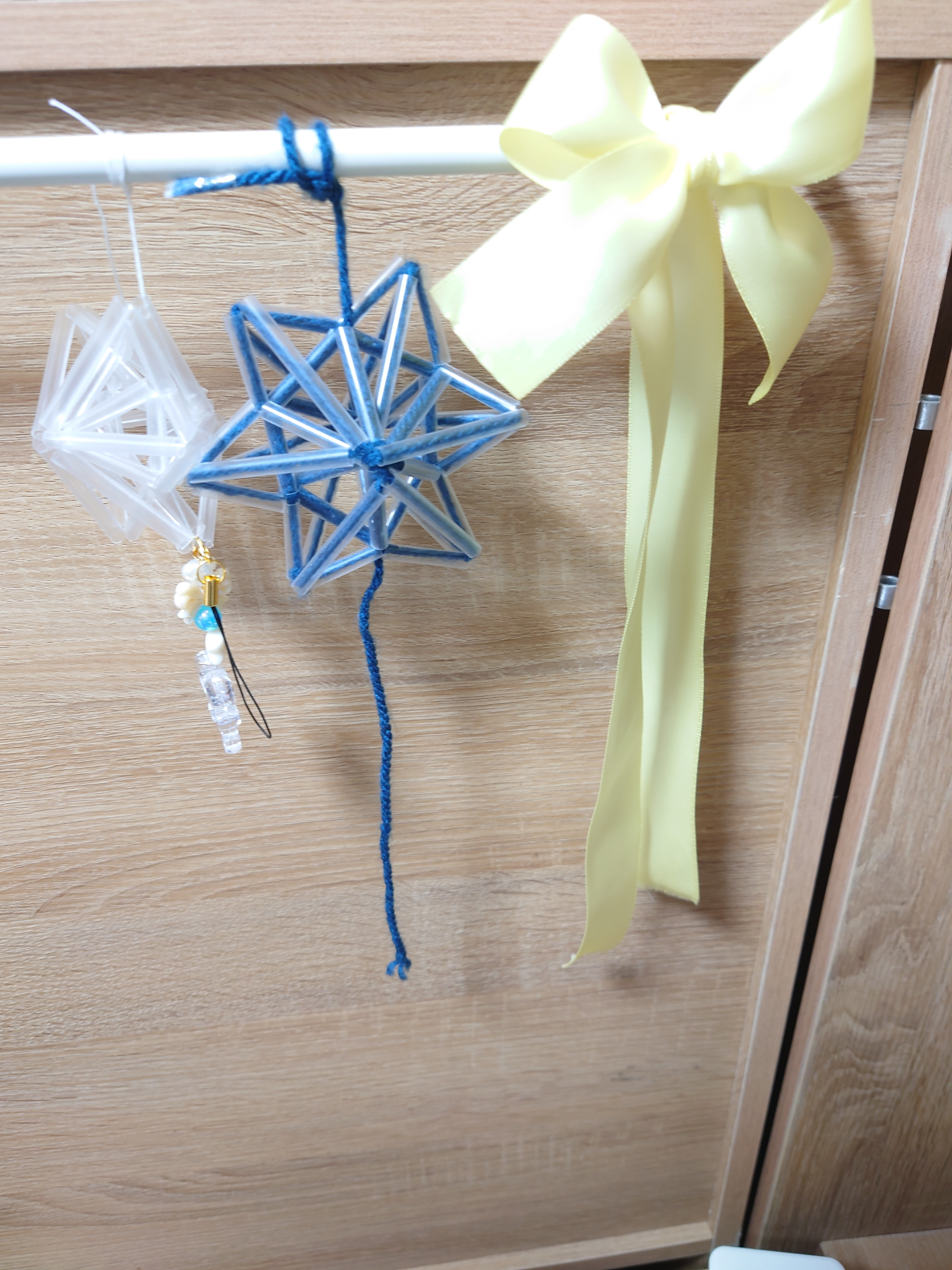 黄色のリボンはシュシュを作った時の余りで、左側の星達はヒンメリという北欧の飾りです。材料はストロー🥤と毛糸🧶です。あんまり綺麗に作れはしなかったんですけど。