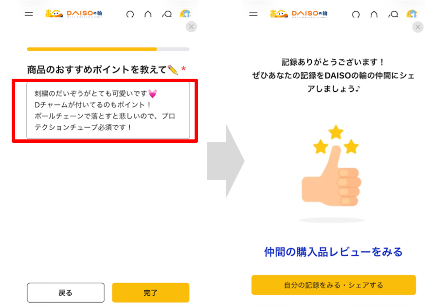 3.おすすめポイントを入力して「完了」すると記録されます。