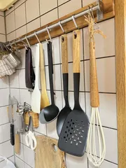 ウッドハンドルのキッチンツール ウッドハンドルのキッチンツール可愛いなと思ってついに、木製×ブラックのツールをゲットしました◎ シリコン製じゃないので"しなり"がなくてちょっとだけ不便ですが見た目には大満足🙂↕️💛(ぜひシリコン製もお願いします…!) 人気みたいで売り切れ店舗が多く、3店舗までよう