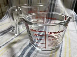 一目惚れして、2サイズ買ってしまいました…250mlと500mlの計量カップ。熱湯OKの耐熱ガラスです。電子レンジやオーブンはNGです。個人的推しポイントは容量の割に低い形が引き出しにしまいやすいところです。口が広いので、中で混ぜたりするのに使いやすいです。