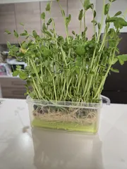 栽培 豆苗さん…DAISOの葱入れ容器を利用し豆苗さんを栽培。スーパーで売ってる豆苗のサイズにジャストフィット!DAISOで豆苗用の容器売ってるけど、葱入れの方が水切りがついてるし、根腐れ見れるので私にはこれがしっくりきました☺