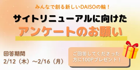 【100Pプレゼント】DAISOの輪リニューアル調査🔎 皆さん、こんにちは!DAISOの輪 運営事務局です。いつも「DAISOの輪」をお楽しみいただき、誠にありがとうございます。 皆さまに大切なお知らせです。 「DAISOの輪」は、より使いやすくワクワクする場所を目指して、26年春にサイトリニューアルを予定しています!「こんなふうに使えたら嬉し