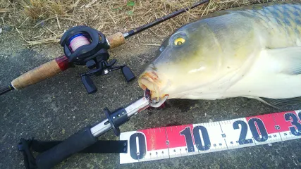 🐟毎度のダイソーベイトリールでついに90センチのクロゴイキタ━━━━(゚∀゚)━━━━!!🐟 今日はお昼から鈴鹿川でダイソーベイトキャスティングリールとダイソークローワームでのルアーフィッシングをしていました!いつものように、ダイソークローワームのテキサスリグで川底をボトムバンピングをしていたら、ドカン!と言う今までに無い強烈なアタックを感じたのでフルフッキングしたら、一気に何十メートルも走