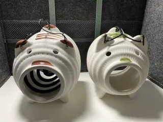 蚊取り線香 豚 右は普通に買ったもの、左の茶色いのがダイソーです。取手の針金はよくわからんままに私がまいたので出来はよくないですが。300円で全然遜色ない!凄いな。