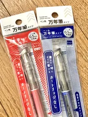 使い切り万年筆 格安万年筆マニアの私が4年ほど前に目撃情報をみかけていたものの、地元でどうしても見つけられなかったカラー万年筆……ずっと手に入れられなかった事を悔やんでいたのですが、新商品で似たようなものが出たと聞いてお店はしごしてきました!🙌 結果2店舗でそれぞれ赤と青をゲット!赤と青しかないのは残念ですが、お手