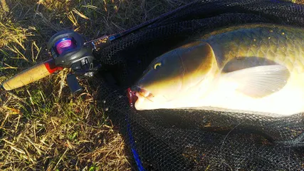 流石にここまで大きなコイになるとスピニングタックルでは厳しいので、ベイトタックルで、リールはダイソーベイトキャスティングリールを使用しないと厳しくなります!(汗) このダイソーベイトキャスティングリールであれば両軸リールなのでランカークロゴイのラージマウスバスの10倍は引く強烈な引きにも十分に耐える