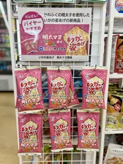 明太マヨ風味、登場! DAISO いかの姿あげ 明太マヨ風味 ¥108JANコード 4901540418514※店舗によっては在庫なし/取り扱いなしの場合がございます。ご了承ください。 かねふく明太子を使用したコラボ商品となります。 ピリッとした明太子の辛味とマヨネーズ