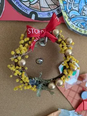 子供作のリース!ミニリース、金のパーツ、マグネットがDAISOさんのものです。ミモザは子供が自分で選んで育てていたものをドライにして使用✨このマグネットも重宝してます!