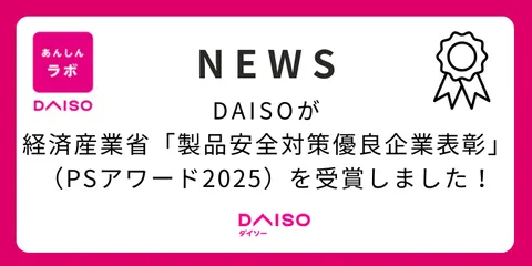 NEW DAISOが「製品安全対策優良企業表彰(PSアワード2025)」を受賞しました! みなさん、こんにちは!DAISOの輪 運営事務局です。本日は、DAISOファンの皆さんにぜひ知っていただきたい、とっても嬉しいニュースをお届けします!なんとこの度、株式会社大創産業(DAISO)が、経済産業省が実施する「令和7年度製品安全対策優良企業表彰(PSアワード2025)」において、「優良賞(