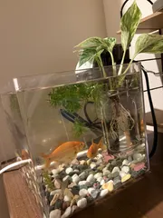 去年の夏祭りの金魚すくいでとった小さな金魚がかなり大きくなりました。 蓄光石を入れて「光った光った!」と子供は大喜び。 石の色に統一感を持たせるには何をどう変えれば良いと思いますか?ぜひご教授ください。